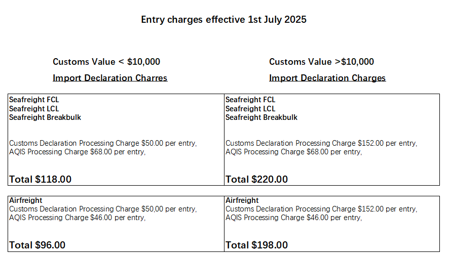 This will result in the standard charge on a containerized sea freight declaration with a customs value over $10K will increase from $218.00 to $220.00, and an air freight declaration from $197 to $198.